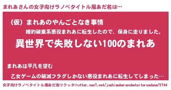 | 男性向けラノベタイトル風あだ名 | 『まれあという概念が存在しない退屈な世界 』 |