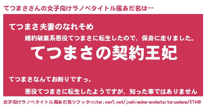 | 男性向けラノベタイトル風あだ名 | 『誰もが恐れるあのてつまさが、ぼくの専属メイドになるようです。』 |