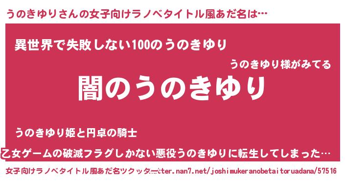 | 男性向けラノベタイトル風あだ名 | 『Re:うのきゆりから始める異世界生活』 |