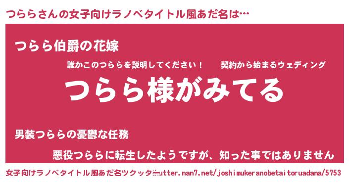 | 男性向けラノベタイトル風あだ名 | 『つららの嫁は女の子じゃないと思った?』 |