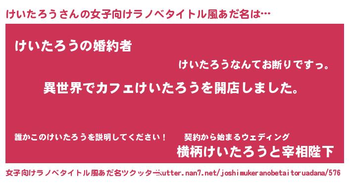| 男性向けラノベタイトル風あだ名 | 『誰もが恐れるあのけいたろうが、ぼくの専属メイドになるようです。』 |
