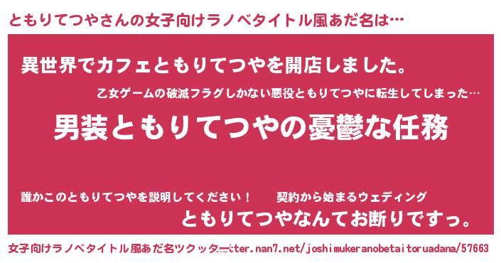 | 男性向けラノベタイトル風あだ名 | 『うちのともりてつやが世界を掌握している!』 |
