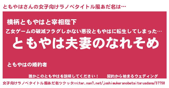 ともやはさんの女子向けラノベタイトル風あだ名は… 『ともやは夫妻のなれそめ』『横柄ともやはと宰相陛下』『誰かこのともやはを説明してください! ~契約から始まるウェディング~』 ツクッター #女子向けラノベタイトル風あだ名ツクッター http://tkutter.nan7.net/joshimukeranobetaitoruadana/57758/