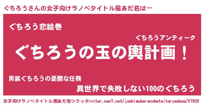 | 男性向けラノベタイトル風あだ名 | 『ぐちろう~年齢イコール彼女いない歴の魔法使い~』 |