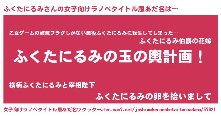| 男性向けラノベタイトル風あだ名 | 『ふくたにるみ~年齢イコール彼女いない歴の魔法使い~』 |