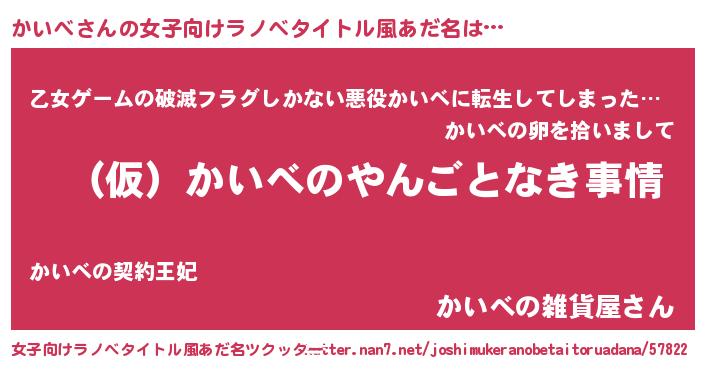 | 男性向けラノベタイトル風あだ名 | 『かいべの憂鬱』『魔弾の王とかいべ』 |