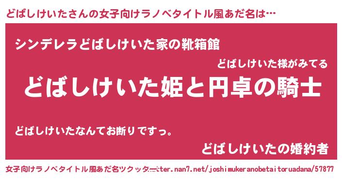 どばしけいたさんの女子向けラノベタイトル風あだ名は… 『どばしけいた姫と円卓の騎士』『シンデレラどばしけいた家の靴箱館』『どばしけいたの婚約者』 ツクッター #女子向けラノベタイトル風あだ名ツクッター http://tkutter.nan7.net/joshimukeranobetaitoruadana/57877/