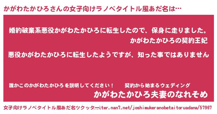 | 男性向けラノベタイトル風あだ名 | 『この素晴らしい世界にかがわたかひろを!』 |