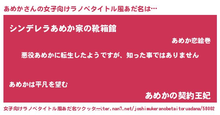 | 男性向けラノベタイトル風あだ名 | 『この素晴らしい世界にあめかを!』 |