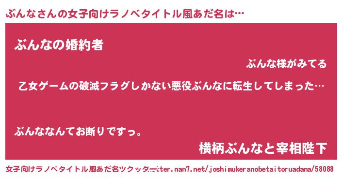 | 男性向けラノベタイトル風あだ名 | 『この素晴らしい世界にぶんなを!』 |