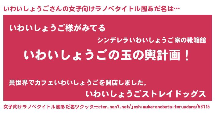 男性向けラノベタイトル風あだ名 | 『いわいしょうご~年齢イコール彼女いない歴の魔法使い~』 |