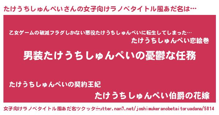 | 男性向けラノベタイトル風あだ名 | 『冴えないたけうちしゅんぺいの育てかた』 |