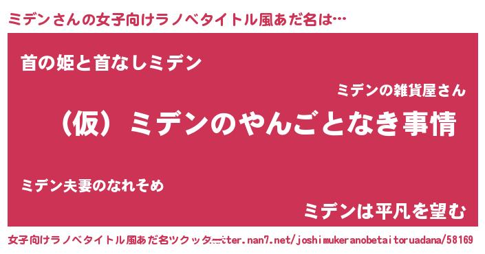 | 男性向けラノベタイトル風あだ名 | 『ミデンの憂鬱』『はたらくミデンさま!』 |