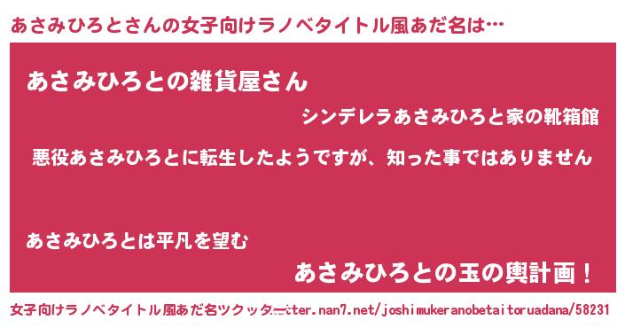 | 男性向けラノベタイトル風あだ名 | 『この素晴らしい世界にあさみひろとを!』 |