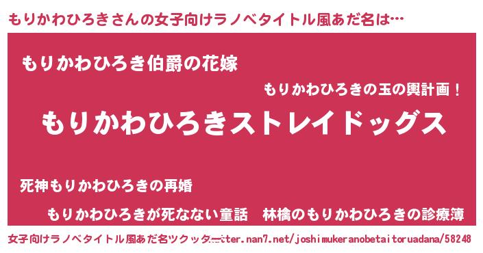 もりかわひろきさんの女子向けラノベタイトル風あだ名は… 『もりかわひろきストレイドッグス』『もりかわひろき伯爵の花嫁』『もりかわひろきが死なない童話 林檎のもりかわひろきの診療簿』 ツクッター #女子向けラノベタイトル風あだ名ツクッター http://tkutter.nan7.net/joshimukeranobetaitoruadana/58248/