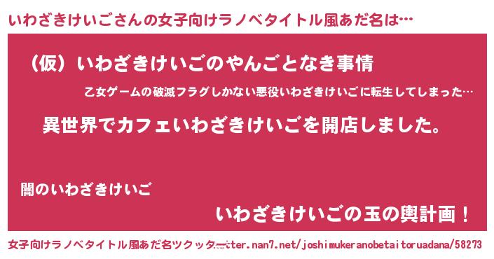 | 男性向けラノベタイトル風あだ名 | 『誰もが恐れるあのいわざきけいごが、ぼくの専属メイドになるようです。』 |