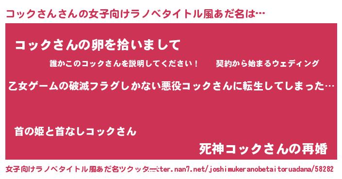 | 男性向けラノベタイトル風あだ名 | 『この素晴らしい世界にコックさんを!』 |
