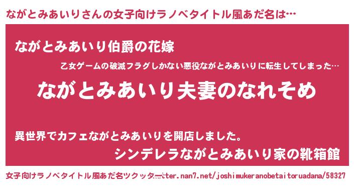| 男性向けラノベタイトル風あだ名 | 『おまえをオタクにしてやるから、俺をながとみあいりにしてくれ! 』 |