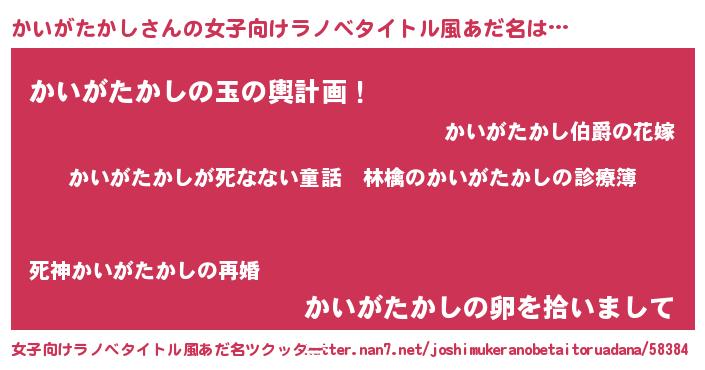 | 男性向けラノベタイトル風あだ名 | 『魔弾の王とかいがたかし』 |