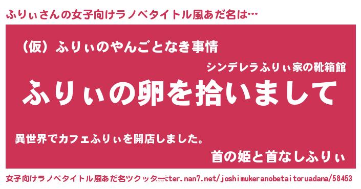 | 男性向けラノベタイトル風あだ名 | 『ダンジョンにふりぃを求めるのは間違っているだろうか』 |