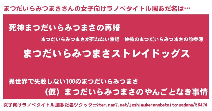 | 男性向けラノベタイトル風あだ名 | 『Re:まつだいらみつまさから始める異世界生活』 |
