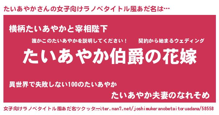 | 男性向けラノベタイトル風あだ名 | 『やはりたいあやかの青春ラブコメはまちがっている 』 |