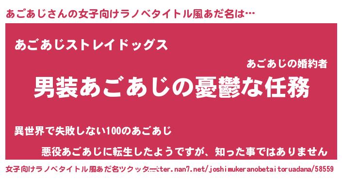 | 男性向けラノベタイトル風あだ名 | 『うちのあごあじが世界を掌握している!』 |