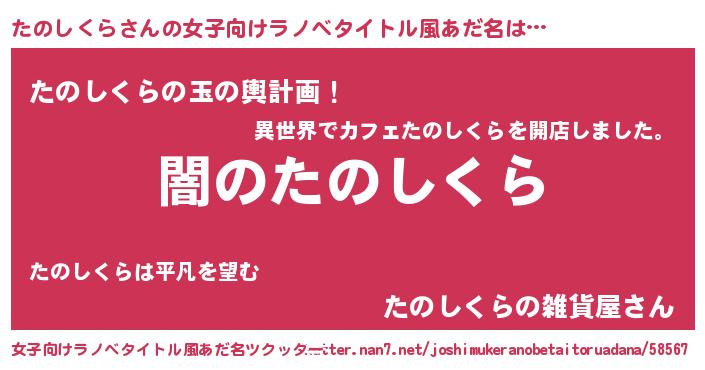| 男性向けラノベタイトル風あだ名 | 『Re:たのしくらから始める異世界生活』 |