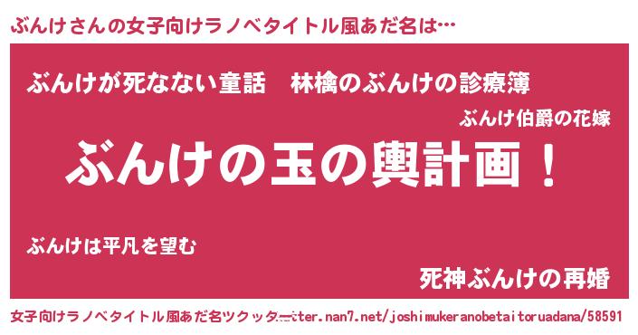 | 男性向けラノベタイトル風あだ名 | 『ぶんけ~年齢イコール彼女いない歴の魔法使い~』 |