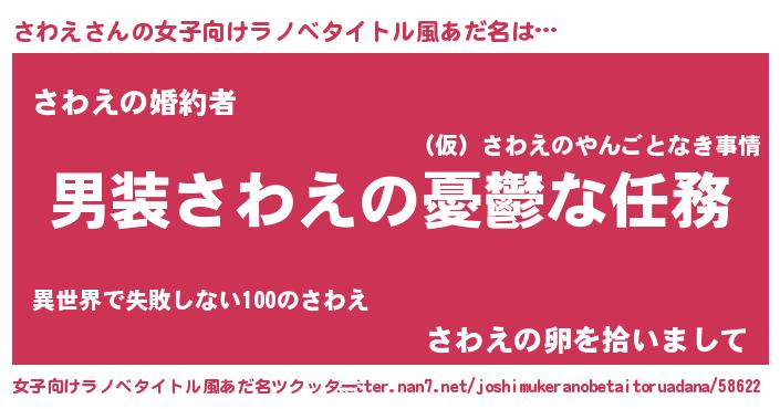 | 男性向けラノベタイトル風あだ名 | 『うちのさわえが世界を掌握している!』 |
