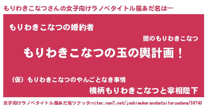 | 男性向けラノベタイトル風あだ名 | 『もりわきこなつ~年齢イコール彼女いない歴の魔法使い~』 |