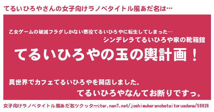 てるいひろやさんの女子向けラノベタイトル風あだ名は… 『てるいひろやの玉の輿計画!』『乙女ゲームの破滅フラグしかない悪役てるいひろやに転生してしまった…』『てるいひろやなんてお断りですっ。』 ツクッター #女子向けラノベタイトル風あだ名ツクッター http://tkutter.nan7.net/joshimukeranobetaitoruadana/58826/