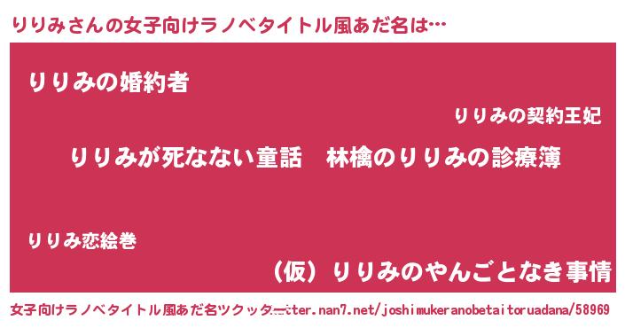 | 男性向けラノベタイトル風あだ名 | 『魔弾の王とりりみ』『りりみの憂鬱』 |