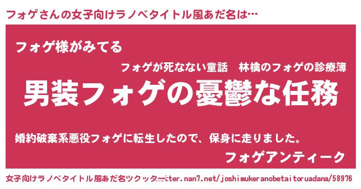 | 男性向けラノベタイトル風あだ名 | 『うちのフォゲが世界を掌握している!』 |