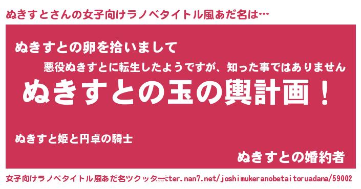 | 男性向けラノベタイトル風あだ名 | 『転生したらぬきすとだった件』 |