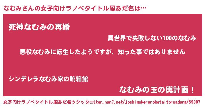 | 男性向けラノベタイトル風あだ名 | 『この素晴らしい世界になむみを!』 |