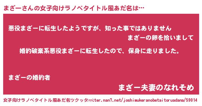 | 男性向けラノベタイトル風あだ名 | 『転生したらまざーだった件』 |