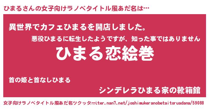 | 男性向けラノベタイトル風あだ名 | 『おまえをオタクにしてやるから、俺をひまるにしてくれ! 』 |