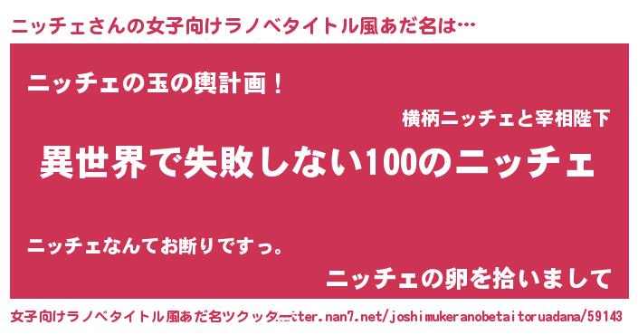 | 意味不明あだ名 | 『永久保存ニッチェ』『自称ニッチェ』 |