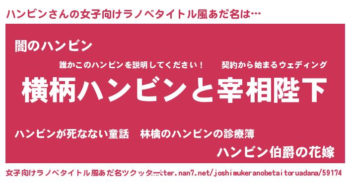| 男性向けラノベタイトル風あだ名 | 『ハンビンに滅ぼされるだけの簡単なお仕事です』 |