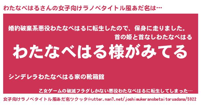 | 男性向けラノベタイトル風あだ名 | 『わたなべはるの嫁は女の子じゃないと思った?』 |