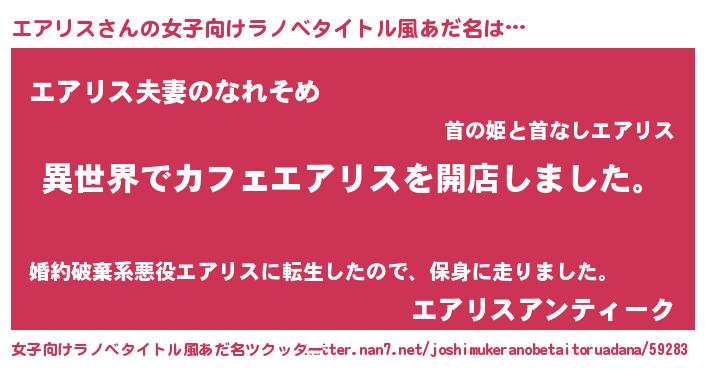 エアリスさんの女子向けラノベタイトル風あだ名は… 『異世界でカフェエアリスを開店しました。』『エアリス夫妻のなれそめ』『エアリスアンティーク』 ツクッター #女子向けラノベタイトル風あだ名ツクッター http://tkutter.nan7.net/joshimukeranobetaitoruadana/59283/