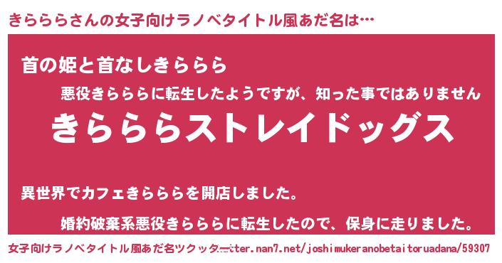 | 男性向けラノベタイトル風あだ名 | 『Re:きらららから始める異世界生活』 |