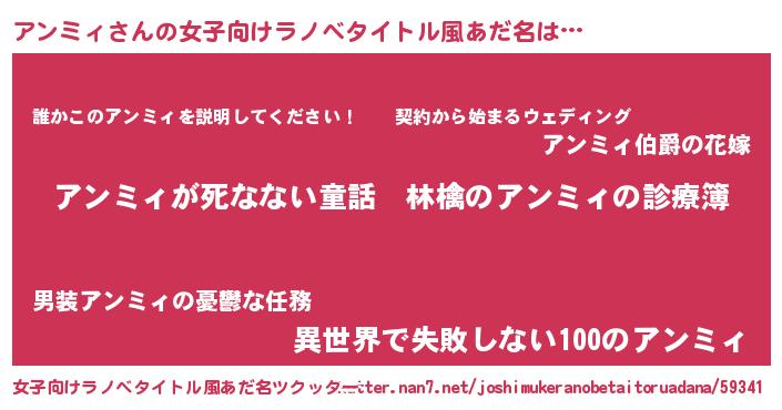 | 男性向けラノベタイトル風あだ名 | 『魔弾の王とアンミィ』 |