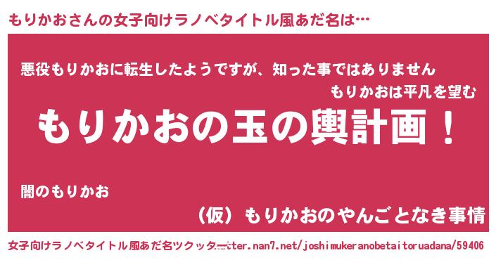 | 男性向けラノベタイトル風あだ名 | 『もりかお~年齢イコール彼女いない歴の魔法使い~』 |