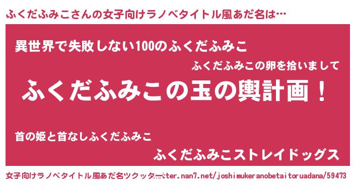 | 男性向けラノベタイトル風あだ名 | 『ふくだふみこ~年齢イコール彼女いない歴の魔法使い~』 |
