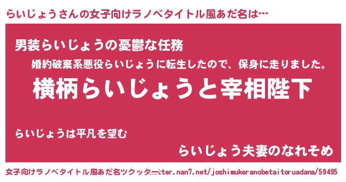 | 男性向けラノベタイトル風あだ名 | 『らいじょうに滅ぼされるだけの簡単なお仕事です』 |