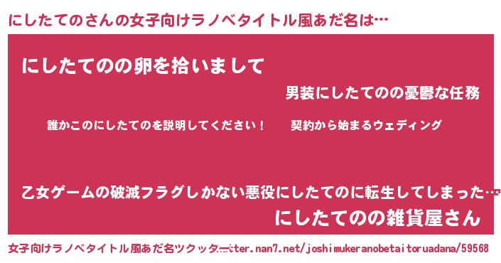 にしたてのさんの女子向けラノベタイトル風あだ名は… 『誰かこのにしたてのを説明してください! ~契約から始まるウェディング~』『にしたてのの卵を拾いまして』『にしたてのの雑貨屋さん』 ツクッター #女子向けラノベタイトル風あだ名ツクッター http://tkutter.nan7.net/joshimukeranobetaitoruadana/59568/