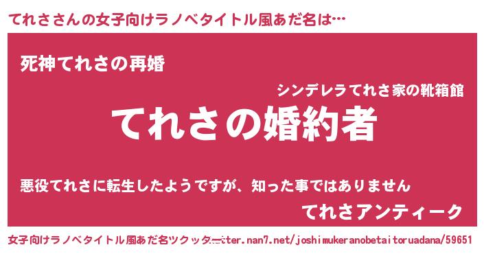 | 男性向けラノベタイトル風あだ名 | 『うちの娘の為ならば、俺はもしかしたらてれさも倒せるかもしれない。』 |