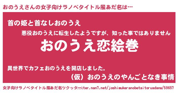 | 男性向けラノベタイトル風あだ名 | 『おまえをオタクにしてやるから、俺をおのうえにしてくれ! 』 |